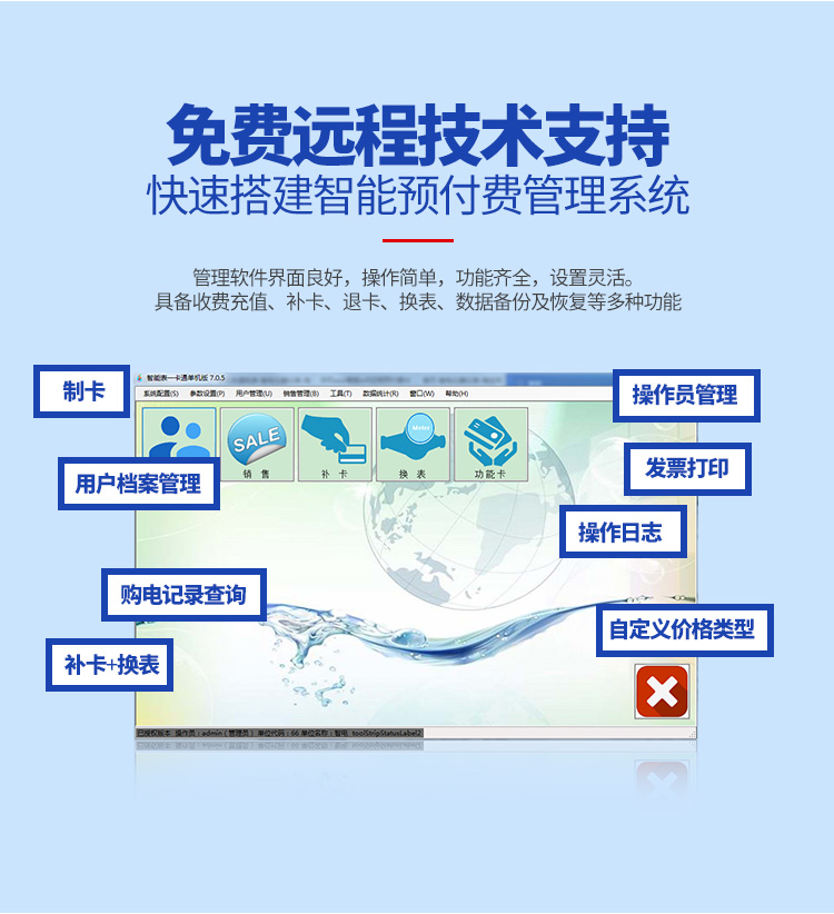 水電一卡通預付費管理系統由本公司生產的預付費電表、預付費水表、讀寫器和一卡通管理軟件構成,物業管理部門可通過本系統完成對水費、電費和天然氣費的智能化管理,無需挨家挨戶抄表收費,由用戶通過一張IC卡購水購電,先交費,后用水用電,解決了抄表累、收費難的問題,該系統是物業管理部門的好幫手, 該管理軟件界面良好,操作簡單方便,易學易用,功能齊全。